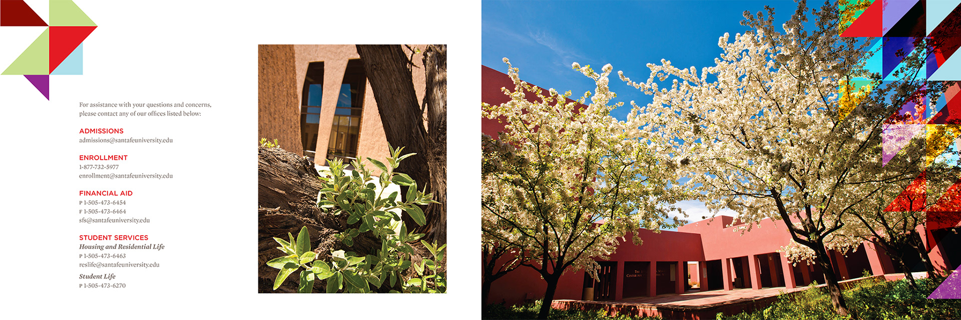 The geometric architecture, vibrant textiles, and overall tactile experience of the city of Santa Fe inspired the university's bold and vibrant brand language. The endless combinations of interlocking triangles set at various transparencies and effects are indicative of the range of courses and opportunities the institution offers students.